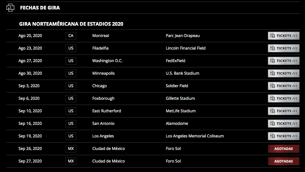 Pero ahora sí es oficial, los dos conciertos programados en nuestro país como parte de la gira por estadios en Norteamérica de la banda, con la que está promocionando su más reciente disco Untiteled (o Rammstein), están completamente agotados y al parecer, la ilusión de que abran una tercera y última fecha para ver el regreso de los alemanes cada vez es menos probable. Si no nos creen, échenle un ojo a su página oficial.